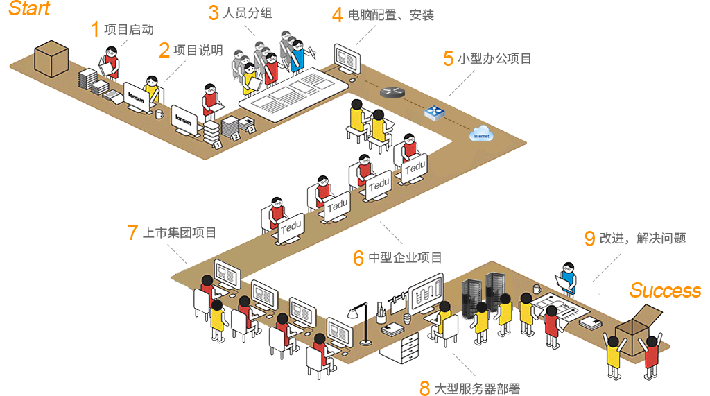 计算机数量200~500的中等规模公司,有统一管理员工桌面系统的需要,公司的一些数据通过文件服务器分享使用、打印机在各部门内分享使用。此项目的系统集成涉及从零开始的办公环境,到最终可正常办公的一条龙服务,比如设计、施工、采购、装系统、装应用、连网配置等等。